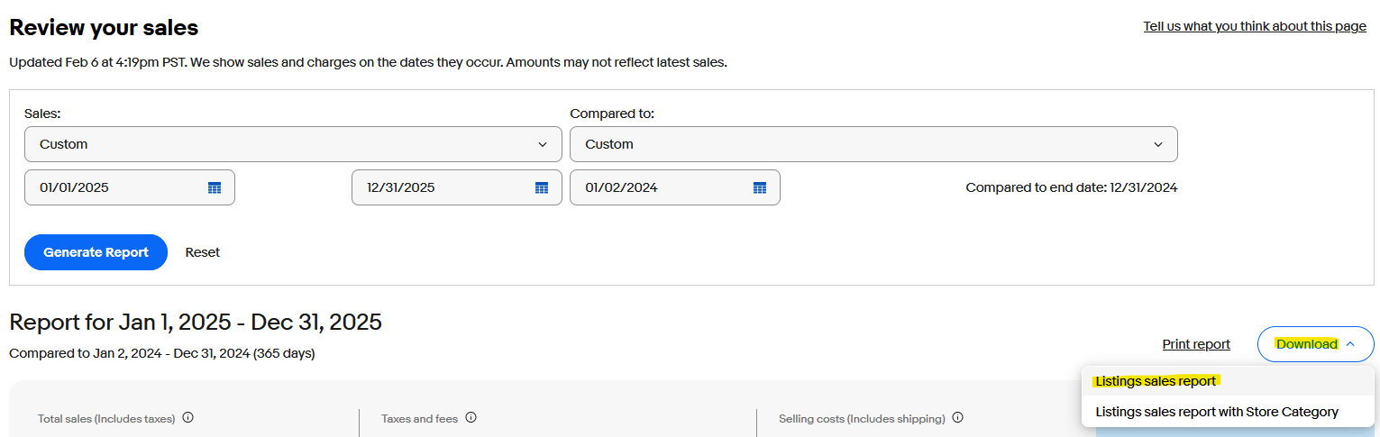 - You will see the page update with some overall numbers. Click the "Download" button on upper right hand side, and then select "Listing Sales Report":
