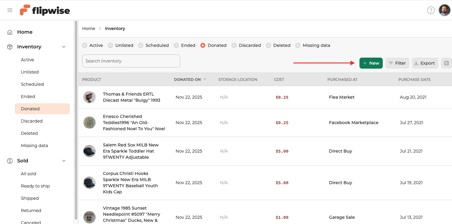 If you have an item in your inventory that was never listed on eBay, but needs to be marked as donated, you can go to your list of Donated items and click the green "+New" button on the top right to simultaneously add it to your inventory and mark it as donated.