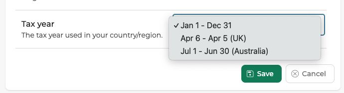 By default, Flipwise will use the tax year specific to your geolocation. However, you can change the tax year by visiting your Account page. Click the user profile image in the top right of any Flipwise page, then choose Your account. Scroll down to "Tax year" as shown below: