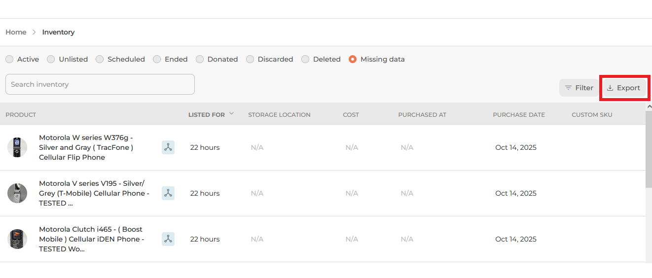 Whenever you are looking at a list of your items in Flipwise, there will be an "Export" button at the top right of your screen: