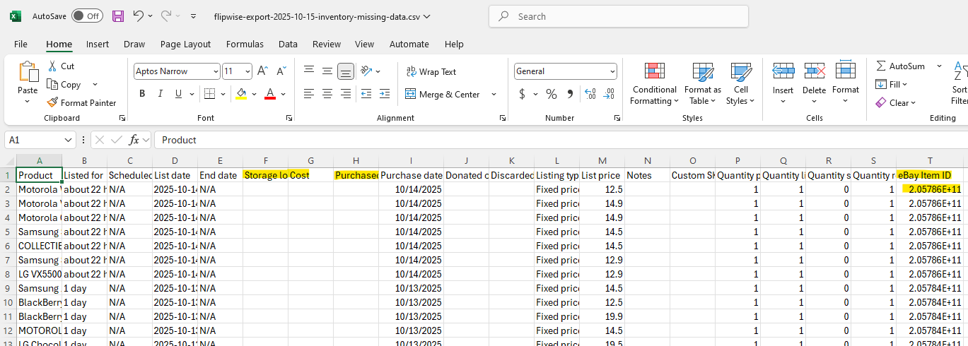 NOTE: The other important field is the "eBay Item ID", which is used when the data is imported back into Flipwise. Unfortunately, Excel interprets this fields as a long number and puts it in scientific notation. If you then save the data to a CSV file, it will truncate and lose part of this ID. The solution is to either: (1) save the file as an Excel Workbook (.xlsx), or (2) right click the column, select "Format Cells", then "Number", then set 0 decimal places, and click "OK".