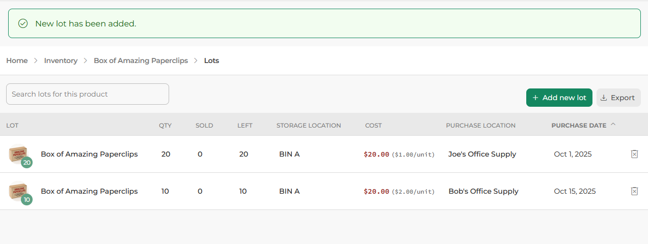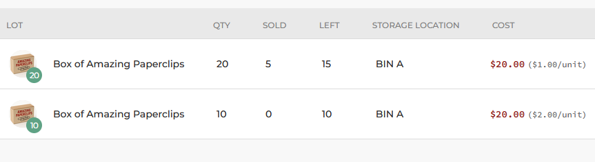 You can see here for example, that 5 boxes of paperclips have been sold, and they have all come from the first lot, so each of these sold units will have the purchase price of $1 when calculating Net Return. Units will continue to be pulled from this lot until all 20 have been sold, after which they will start being pulled from the second lot, and the profit will be based on a purchase price of $2/unit.