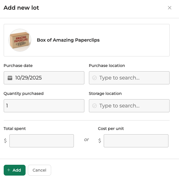 This gives you two options. If you don't want to create a new lot, you can just update the existing quantity for the item by changing the number and clicking "Update quantity". But if you would like to create a new Acquisition Lot, click "+Add new lot", and a new dialog will appear (below) that lets you enter the specific information for the new lot of items that you have purchased. Note that you can enter the cost of these new items either by putting the overall cost of the lot, or by putting the individual unit cost. Flipwise will automatically calculate the other value.