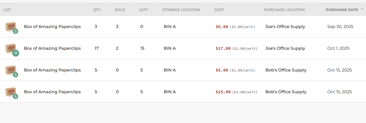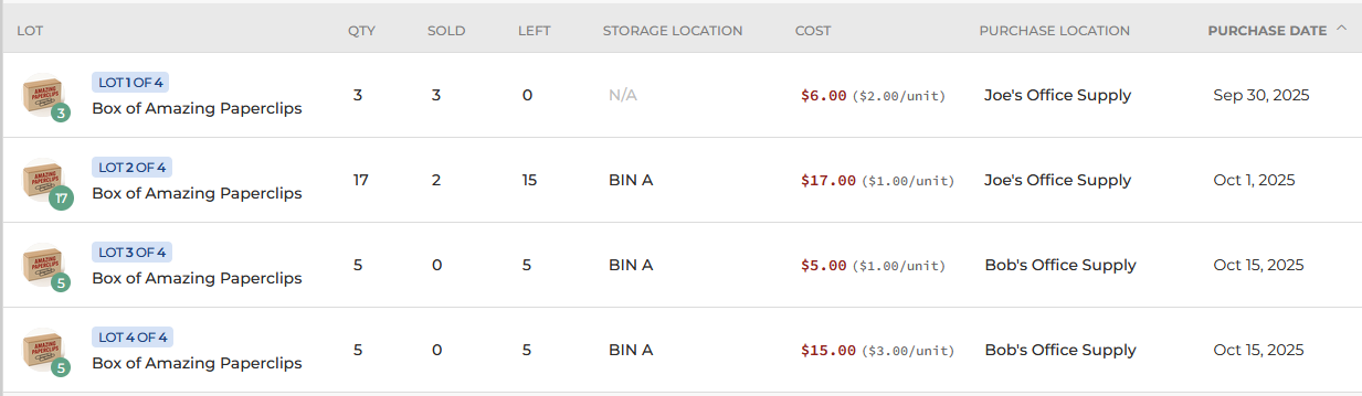 Flipwise allows you to split units of a Multi-Quantity listing into separate "Acquisition Lots." Each lot will have its own set of acquisition data: Purchase Price, Purchase Date, Purchase Location, and Storage Location.
